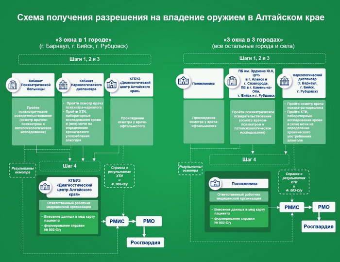 В соответствии с требованиями Федеральных законов от 13.12.1996 № 150-ФЗ «Об оружии» и от 21.11.2011 № 323-ФЗ «Об основах охраны здоровья граждан в Российской Федерации», от 02.07.2021 № 313-ФЗ «О внесении изменений в Федеральный закон «Об оружии» и статьи 79 и 91.1 Федерального закона «Об основах охраны здоровья граждан в Российской Федерации», административных регламентов, утвержденных приказами Федеральной службы войск национальной гвардии Российской Федерации (Росгвардии) от 20.03.2019 № 93 «Об утверждении Административного регламента Федеральной службы войск национальной гвардии Российской Федерации по предоставлению государственной услуги по выдаче гражданину Российской Федерации лицензии на приобретение огнестрельного оружия ограниченного поражения и патронов к нему», от 26.06.2018 № 222 «Об утверждении Административного регламента Федеральной службы войск национальной гвардии Российской Федерации по предоставлению государственной услуги по выдаче гражданину Российской Федерации лицензии на приобретение охотничьего или спортивного огнестрельного оружия с нарезным стволом и патронов к нему», от 26.06.2018 № 221 «Об утверждении Административного регламента Федеральной службы войск национальной гвардии Российской Федерации по предоставлению государственной услуги по выдаче гражданину Российской Федерации разрешения на хранение и ношение охотничьего огнестрельного длинноствольного оружия, спортивного огнестрельного гладкоствольного длинноствольного оружия, охотничьего пневматического оружия или огнестрельного оружия ограниченного поражения и патронов к нему», от 11.05.2018 № 172 «Об утверждении Административного регламента Федеральной службы войск национальной гвардии Российской Федерации по предоставлению государственной услуги по выдаче гражданину Российской Федерации лицензии на приобретение газовых пистолетов, револьверов, сигнального оружия, холодного клинкового оружия, предназначенного для ношения с национальными костюмами народов Российской Федерации или казачьей формой, а также лицензии на приобретение отдельной модели боевого холодного клинкового оружия (кортика), унаследованной в соответствии с законодательством Российской Федерации», от 12.08.2019 № 283 «Об утверждении Административного регламента Федеральной службы войск национальной гвардии Российской Федерации по предоставлению государственной услуги по выдаче гражданину Российской Федерации разрешения на хранение и ношение наградного оружия и патронов к нему», от 17.06.2019 № 208 «Об утверждении Административного регламента Федеральной службы войск национальной гвардии Российской Федерации по предоставлению государственной услуги по выдаче гражданину Российской Федерации разрешения на хранение и ношение спортивного огнестрельного длинноствольного оружия, охотничьего огнестрельного длинноствольного оружия, используемого для занятий спортом, спортивного пневматического оружия с дульной энергией свыше 7,5 Дж и патронов к нему», от 17.06.2019 № 207 «Об утверждении Административного регламента Федеральной службы войск национальной гвардии Российской Федерации по предоставлению государственной услуги по выдаче гражданину Российской Федерации разрешения на хранение огнестрельного гладкоствольного длинноствольного оружия самообороны и патронов к н